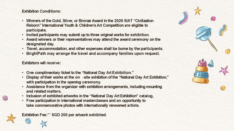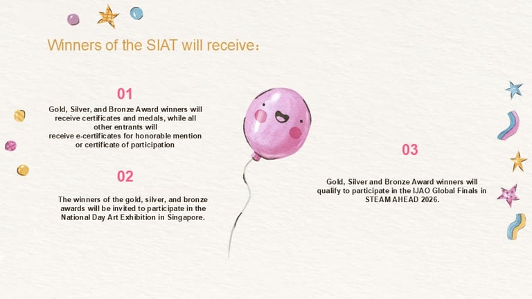 SIAT 2026 is a premier international youth art competition organized by the Singapore International Children’s Media (SICM), under the auspices of the International Ministry of Youth Leadership (Singapore). It is co-organized by the Federation of Arts Society Singapore (FASS), Youth Century International Arts Education Centre (YCAC), and the Singapore International Math Contests Centre (SIMCC).